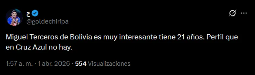 Ahora bien, más allá de este pedido/deseo por parte del DT del Altiplano, ¿Qué jugadores se podrían buscar? Sin dudas Miguel Terceros se llevó todas las miradas y comentarios en las redes sociales. Incluso, sobre el hombre del Santos de Brasil se comentó en X: “Miguel Terceros de Bolivia es muy interesante tiene 21 años. Perfil que en Cruz Azul no hay”.