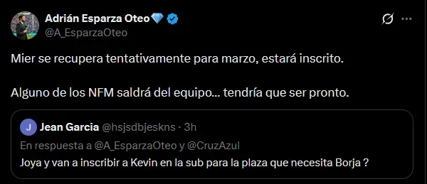 Estas palabras vienen a partir del seguidor Jean García, quien le consultó: “¿Van a inscribir a Kevin (Mier) en la Sub-21 para la plaza (NFM) que necesita Borja?”. Esto quiere decir que la directiva y cuerpo técnico deberán decidir qué extranjero (o más de uno) tendrá que salir de la institución cementera.