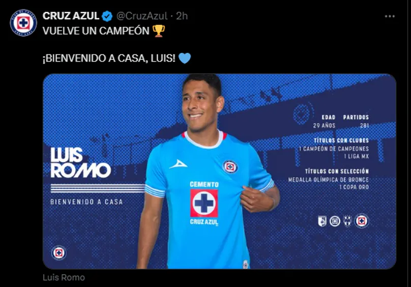 Las novedades parecen nunca acabar para Cruz Azul, quien este lunes presentó en sus canales formales a su cuarto refuerzo: Luis Romo. Si bien esto se sabía desde la semana pasada, e incluso se hizo presente en el triunfo por la jornada uno ante Mazatlán, faltaba la oficialización que dejara 100% tranquilos a los aficionados.
