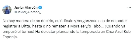 “No hay manera de no decirlo, es ridículo y vergonzoso eso de no poder registrar a Ditta, hasta que no rematen a Morales y/o Tabó…. ¡Cuando ya empezó el torneo! Ha de estar planeando la temporada en Cruz Azul Bob Esponja“, lanzó el analista a través de su cuenta de Twitter.