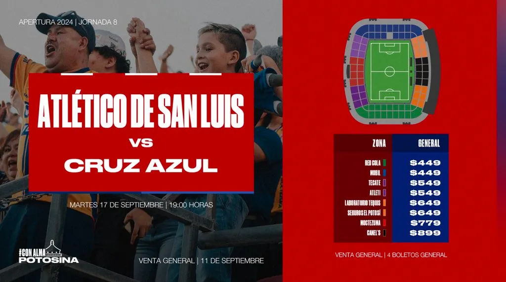 De esta manera, Atlético San Luis también confirmó el precio de los boletos para el encuentro ante La Máquina en la jornada doble del Apertura 2024. La entrada más barata tiene un costo de 449 pesos en la zona más alta del inmueble, mientras que la más cara cuesta 899 pesos en la zona baja.