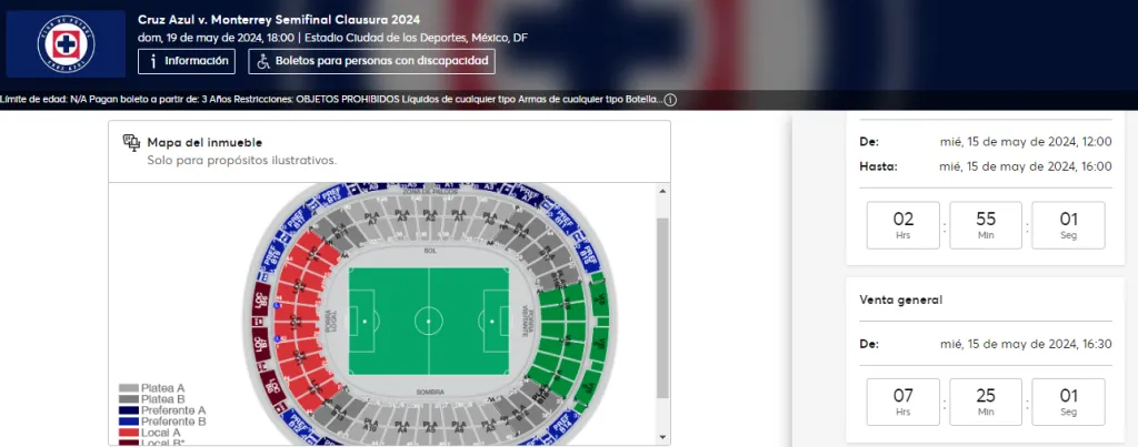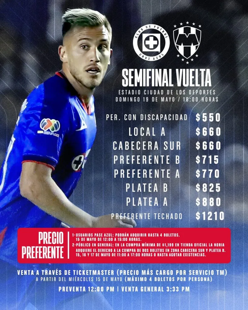 Ticketmaster ya confirmó la fecha para la venta de boletos de Cruz Azul ante Monterrey en la Vuelta de Semifinal. Arranca para la afición en general este miércoles 15 de mayo, a través de Ticketmaster, una vez que finalice la preventa para abonados, a partir de las 16:30 horas.