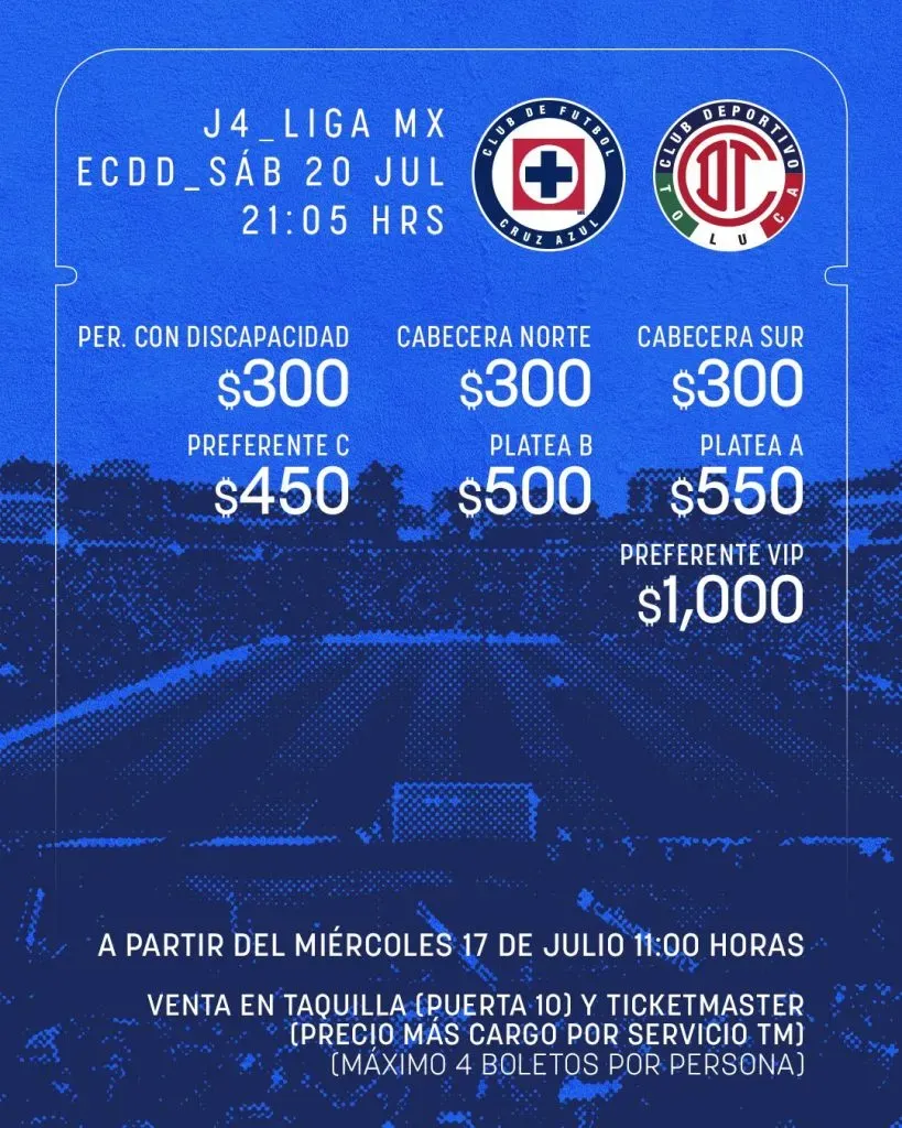 La buena noticia para la afición celeste, es que también podrá evitar el cargo extra por el servicio de compra en línea, si así lo desea. Esto, debido a que el club cementero confirmó la venta física de boletos en la taquilla que está ubicada en la Puerta 10 del inmueble.