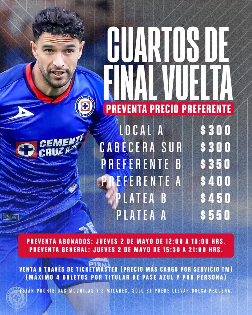 Hay que destacar que Cruz Azul también confirmó que en esta fase de venta las entradas tendrán precios preferenciales. Así, la entrada más barata tiene un costo de $300 pesos en la zona local, mientras que la más cara $550 pesos, en platea, más el cargo por servicio y de envío de Ticketmaster.