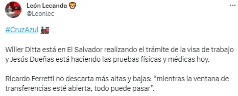 De acuerdo a información del periodista de ESPN, León Lecanda, “Jesús Dueñas está haciendo las pruebas físicas y médicas” este lunes 10 de julio. De esta manera, lo único que falta es que firme su contrato y sea presentado oficialmente por Cruz Azul.