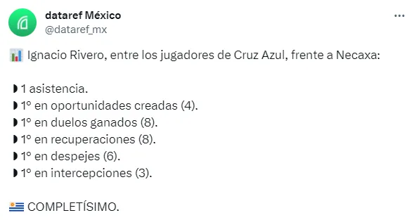 Después, don Ignacio Rivero se convirtió en el jugador que más oportunidades creó, también el mejor en duelos ganados, recuperaciones, despejes y hasta en intercepciones, tal como lo registró Dataref México, al finalizar el encuentro de La Máquina.