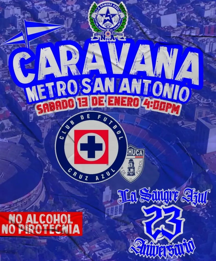 “Cita para el día sábado a las 4:00 p.m. en metro San Antonio. Es un llamado a todos los azules para asistir a la caravana en nuestro regreso a la colonia Noche Buena. Es hora de unir voces y marchar juntos a la que fue y siempre será nuestra casa, respaldemos a nuestro equipo en esta nueva etapa y juntos luchemos por la Décima copa”, publicó La Sangre Azul en su cuenta de Facebook.