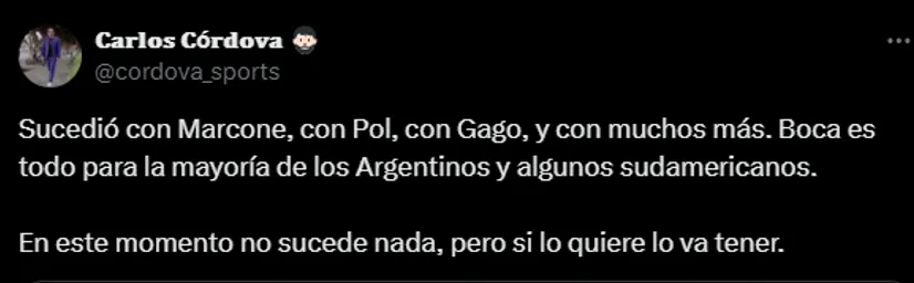 Por otro lado, el periodista Carlos Córdova deslizó una posibilidad alarmante: “Sucedió con Marcone, con Pol, con Gago, y con muchos más. Boca es todo para la mayoría de los argentinos y algunos sudamericanos. En este momento no sucede nada, pero si lo quiere lo va tener…”, sentenció al respecto.