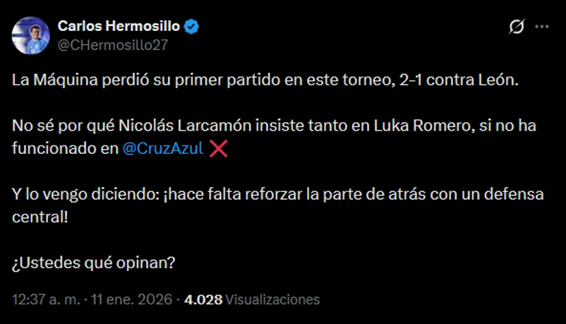 Ante este panorama, el histórico goleador Carlos Hermosillo no guardó silencio y utilizó sus redes sociales para expresar su profunda molestia con el desempeño de ciertos elementos. El “Grandote de Cerro Azul” fue tajante al cuestionar la titularidad de Luka Romero, quien no ha logrado demostrar el nivel necesario para marcar diferencia en una institución con la exigencia celeste.