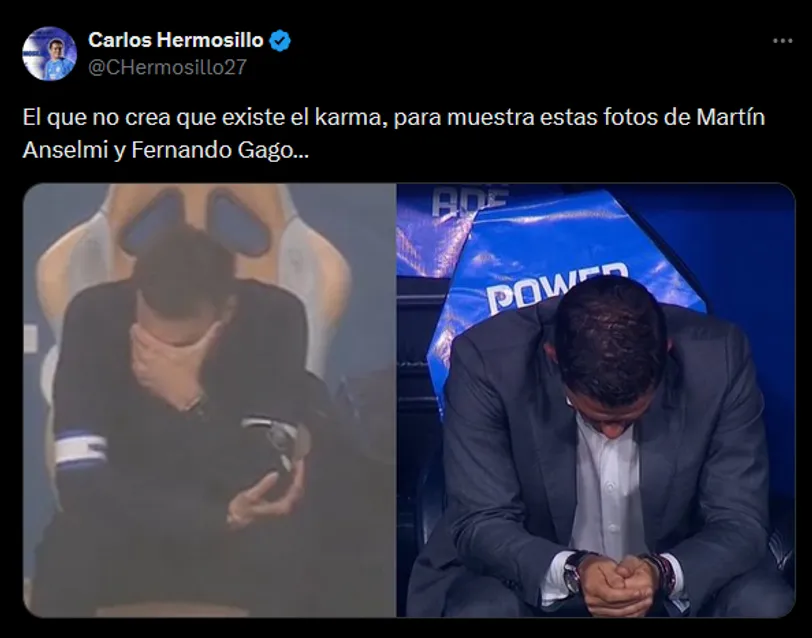 En sus redes sociales personales, el ex delantero compartió las postales dónde se aprecian a los técnicos con la mirada al piso, tras sus mencionadas eliminaciones, acompañado con crudo mensaje. “El que no crea que existe el karma, para muestra estas fotos de Martín Anselmi y Fernando Gago…”, expresó.