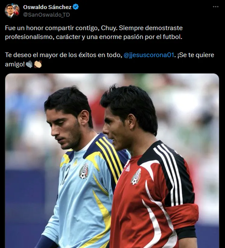 Otra personalidad del futbol mexicano y ex compañero en el Tri como lo fue Oswaldo Sánchez también le dejó su recado, acompañado de una imagen juntos que compartió a través de X. “Fue un honor compartir contigo, Chuy. Siempre demostraste profesionalismo, carácter y una enorme pasión por el futbol. Te deseo el mayor de los éxitos en todo, ¡Se te quiere, amigo!