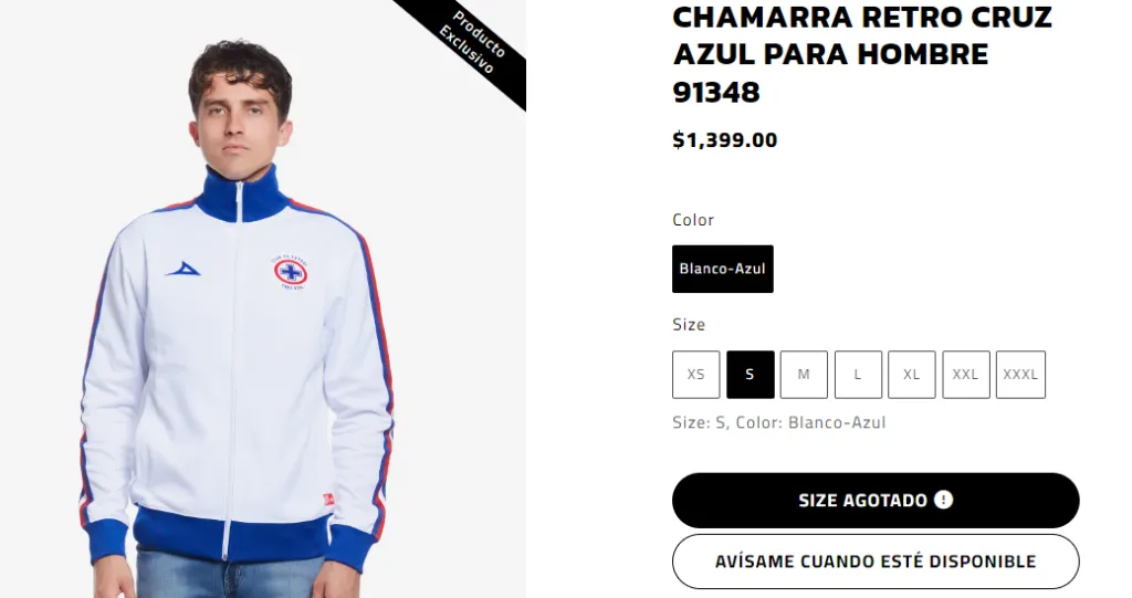 La única que se encuentra en todas sus tallas es la chamarra retro de Cruz Azul, del mismo modelo, pero en versión de mujer, la cual tiene el mismo precio. No obstante, también ya queda poco stock a la venta, pues figuran pocas piezas, sobre todo en talla XS y XXL.