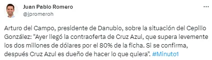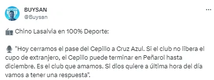“Hoy cerramos el pase del Cepillo a Cruz Azul. Si el club no libera el cupo de extranjero, el Cepillo puede terminar en Peñarol hasta diciembre. Es el club que amamos. Si dios quiere a última hora del día vamos a tener una respuesta“, advirtió por su parte el representante del juvenil, Edgardo Lasalvia.