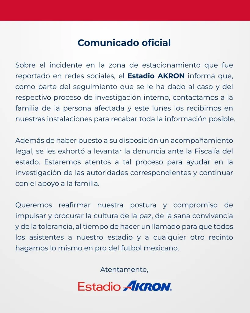 Ante este contexto, la cuenta oficial del Estadio Akron realizó un comunicado con lo sucedido: “Como parte del seguimiento que se le ha dado al caso y del respectivo proceso de investigación interno, contactamos a la familia de la persona afectada y este lunes los recibimos en nuestras instalaciones para recabar toda la información posible. Además de haber puesto a su disposición un acompañamiento legal, se les exhortó a levantar la denuncia ante la Fiscalía del estado”.