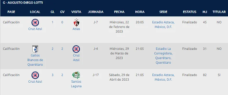 Durante su breve estancia en Cruz Azul, Augusto Lotti logró anotar únicamente tres goles, en los 22 partidos totales que disputó; 19 de ellos en la Liga MX y tres más en la Leagues Cup 2023, donde no pudo estremecer las redes ni una sola vez.