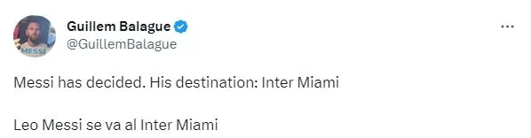 En las últimas horas se ha informado que Lionel Messi estaba muy cerca del Inter Miami, perohay una persona muy especial que ya lo confirmó. Guillem Balagué es un periodista español que ha escrito la más reciente biografía del delantero de 35 años y que resulta muy cercano a su familia. En su cuenta de Twitter confirmó que el argentino jugará en los Estados Unidos en la siguiente temporada.