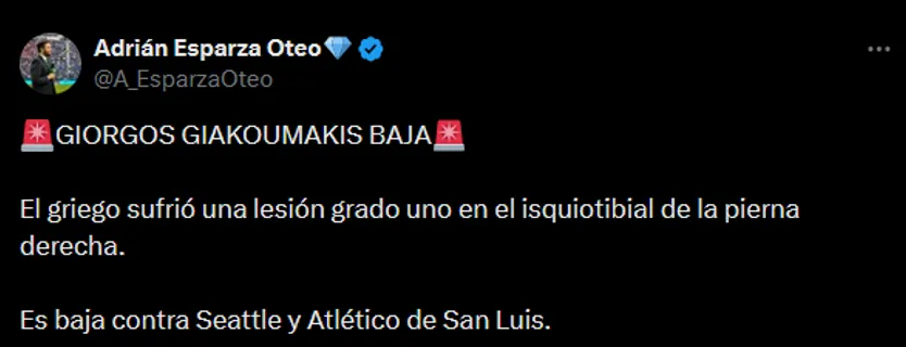 Así lo reveló el periodista Adrián Esparza Oteo en su cuenta personal de X: “GIORGOS GIAKOUMAKIS BAJA. El griego sufrió una lesión grado uno en el inquisitorial de la pierna derecha. Es baja contra Seattle y Atlético de San Luis“, agregó para la decepción de los fanáticos de Cruz Azul. Sin embargo, podría quedar afuera por otros cotejos más dependiendo de la gravedad del desgarro.