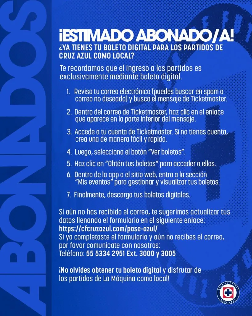 Cruz Azul confirmó que los aficionados ya no necesitarán más el Pase Azul de manera física para ingresar a los partidos de local en el Estadio Olímpico Universitario. Esto, debido a que ahora podrán ingresar con un boleto digital, a través de Ticketmaster.