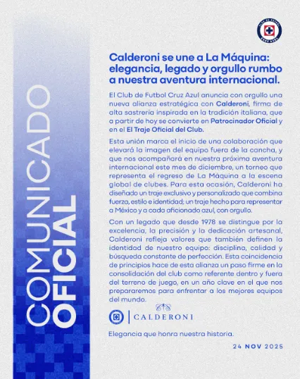 “El Club de Futbol Cruz Azul anuncia con orgullo una nueva alianza estratégica con Calderoni, firma de alta sastrería inspirada en la tradición italiana, que a partir de hoy se convierte en Patrocinador Oficial y en el El Traje Oficial del Club…