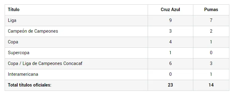 Y es que, como no podía ser de otra manera, uno de los ámbitos más importantes en los que compiten, como dos de los equipos grandes del futbol mexicano, es en el número de títulos. Sin embargo, la diferencia es abismal, a pesar de que los universitarios tienen más años en Primera División.
