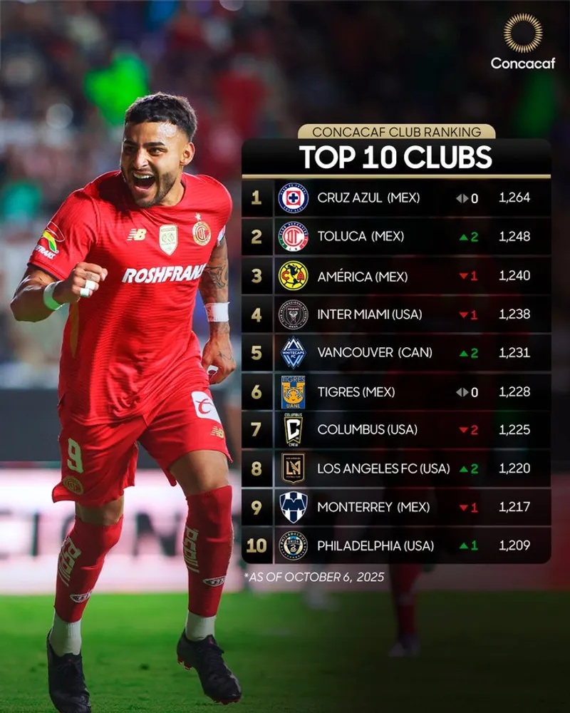 Con 1264 puntos todavía reluce la chapa de campeón de Concachampions. Sin embargo, Toluca viene de ganar la Campeones Cup ante Los Ángeles Galaxy y escaló dos posiciones, logrando el segundo puesto con 1248 unidades. Cierra el podio América con 1240 puntos, prometiendo dar pelea para el liderato.