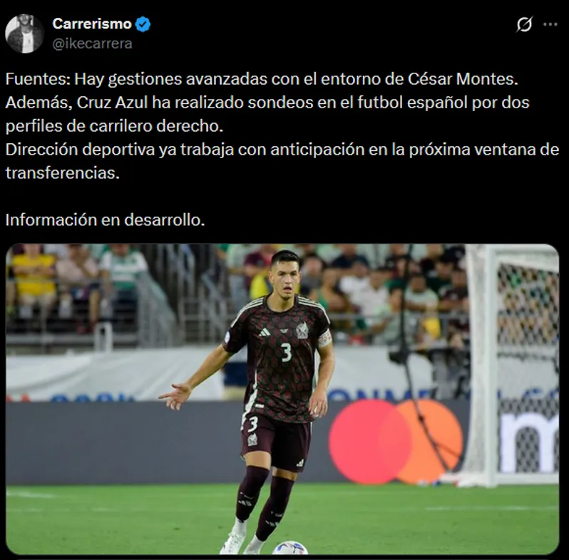 “Fuentes: Hay gestiones avanzadas con el entorno de César Montes. Además, Cruz Azul ha realizado sondeos en el futbol español por dos perfiles de carrilero derecho. Dirección deportiva ya trabaja con anticipación en la próxima ventana de transferencias”, expresó para la locura de los aficionados celestes.