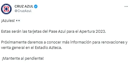 Cruz Azul lanzó una serie de fechas para poder adquirir el Pase Azul para el Apertura 2023, las cuales incluyen un periodo para renovar, así como para reubicar y la última para comprarlo por primera vez. La venta será en línea a través de Ticketmaster del 27 de junio al 9 de julio; y presencial por la puerta 2 del Estadio Azteca, de 11 a 17:00 horas.