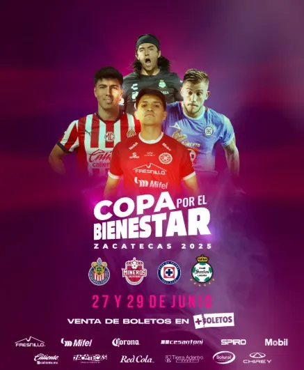 La Copa por el Bienestar 2025 se jugará en Zacatecas del 27 al 29 de junio y contará con la participación de Cruz Azul, Mineros de Zacatecas, Chivas de Guadalajara y el Santos Laguna.