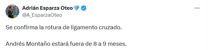 Si bien en el parte médico oficial señalaron que los plazos dependerán en gran medida de su evolución, las generalidades en torno a este tipo de lesiones apuntan, como mínimo, a seis meses. Adrián Esparza Oteo dio señales al respecto y remarcó que “estará fuera entre 8 y 9 meses”, por lo que de esa manera quedaría fuera de acción hasta comienzos del 2026.