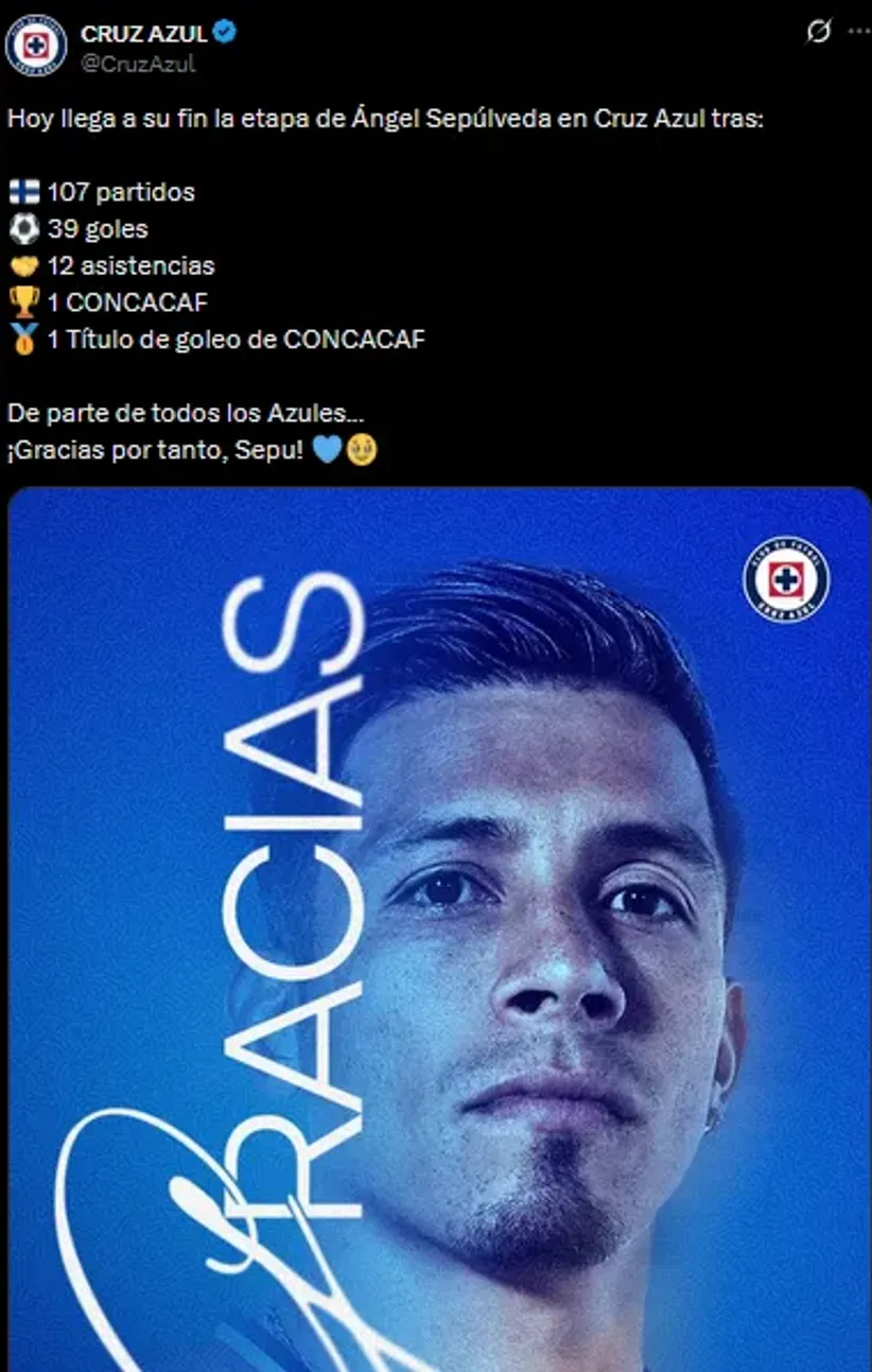 Es por eso que este 18 de diciembre, Cruz Azul lo despidió de manera oficial a través de sus redes sociales, algo que tomó notoriedad rápidamente. “Hoy llega a su fin la etapa de Ángel Sepúlveda en Cruz Azul tras (repasa todos sus goles, estadísticas y más). De parte de todos los Azules…¡Gracias por tanto, Sepu!”.