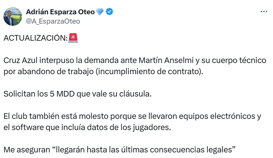“Cruz Azul interpuso la demanda ante Martín Anselmi y su cuerpo técnico por abandono de trabajo (incumplimiento de contrato). Solicitan los 5 MDD que vale su cláusula. El club también está molesto porque se llevaron equipos electrónicos y el software que incluía datos de los jugadores. Me aseguran ‘llegarán hasta las últimas consecuencias legales’”, advirtió el periodista de TUDN.