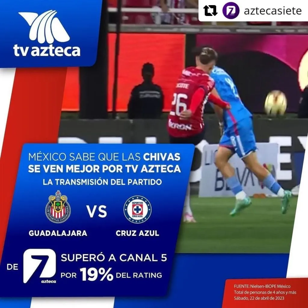 Así lo dio a conocer TV Azteca a través de sus redes sociales, donde presumió que la transmisión del partido de Cruz Azul frente a Chivas en el Canal 7 superó a la de Canal 5 de Televisa por el 19% del rating total, con base en los datos de Nielsen IBOPE.