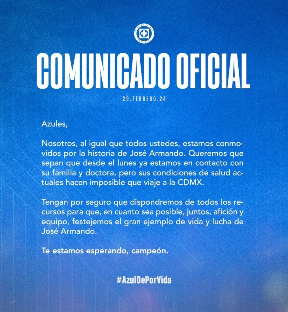 “Tengan por seguro que dispondremos de todos los recursos para que, en cuanto sea posible, juntos, afición y equipo, festejemos el gran ejemplo de vida y lucha de José Armando. Te estamos esperando, Campeón”, sentenció Cruz Azul en el mismo documento.