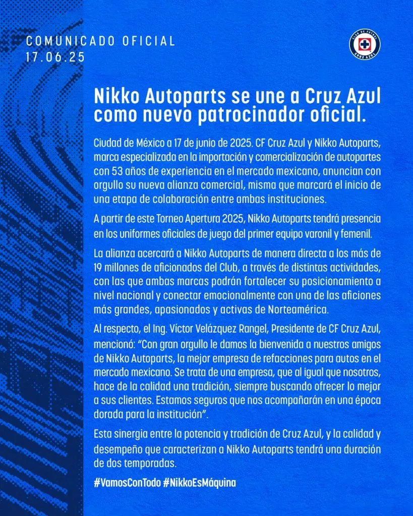 Bajo esta iniciativa institucional, Cruz Azul anunció una nueva alianza con Nikko Autoparts, una empresa líder en la comercialización e importación de autopartes. Se puede leer en el anuncio: “A partir de este Torneo Apertura 2025, Nikko Autoparts tendrá presencia en los uniformes oficiales de juego del primer equipo varonil y femenil. La alianza acercará a Nikko Autoparts de manera directa a los más de 19 millones de aficionados del Club, a través de distintas actividades, con las que ambas marcas podrán fortalecer su posicionamiento a nivel nacional y conectar emocionalmente con una de las aficiones más grandes, apasionadas y activas de Norteamérica”.