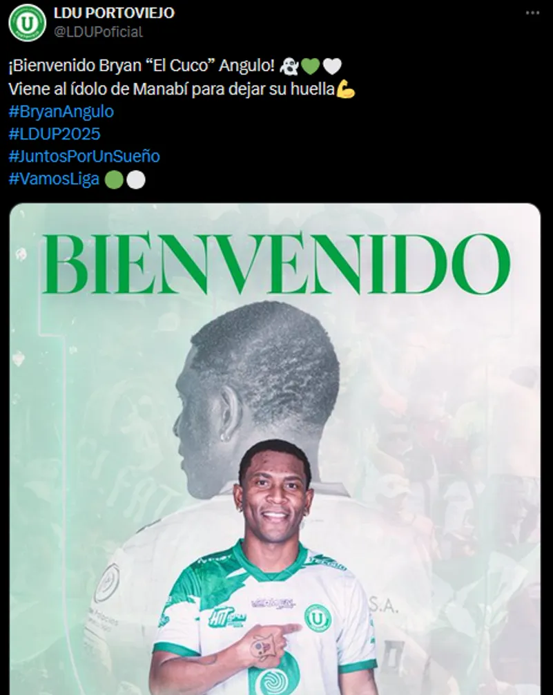 El anuncio fue realizado a través de las redes sociales del club manabita, con una imagen y un mensaje que resaltó su figura. “¡Bienvenido Bryan ‘El Cuco’ Angulo! Viene al ídolo de Manabí para dejar su huella”, publicaron desde LDU Portoviejo. La afición ya celebra el arribo de un delantero con recorrido internacional.