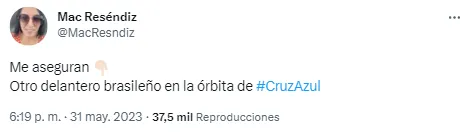 Así lo reveló la reportera de ESPN, Mac Reséndiz, quien a través de su cuenta de Twitter publicó: “Me aseguran. Otro delantero brasileño en la órbita de Cruz Azul”. De todas maneras, la fuente no se animó a dar el nombre que estaría en el radar del cuadro de La Noria, pero las especulaciones no se hicieron esperar.