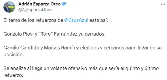 Por su parte, el periodista de TUDN, reafirmó dicha versión, al advertir que Cruz Azul podría sorprender con un último fichaje para terminar de apuntalar su ataque. “Se analiza si llega un volante ofensivo más que sería el quinto y último refuerzo”, publicó a través de su cuenta de Twitter.