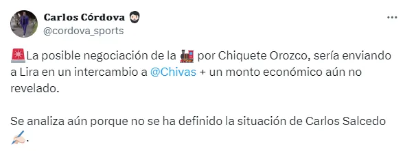 “La posible negociación de La Máquina por Chiquete Orozco, sería enviando a Lira en un intercambio a Chivas más un monto económico aún no revelado. Se analiza aún porque no se ha definido la situación de Carlos Salcedo“, publicó el también ex director de comunicación de La Máquina.