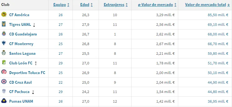 Hay que destacar que la diferencia entre el primer y el segundo lugar es de más de 15 millones de euros, reafirmando el poder de la cartera en Coapa, que incluso relegó a los poderosos de Monterrey, Tigres y Rayados, al segundo y cuarto puesto, respectivamente.