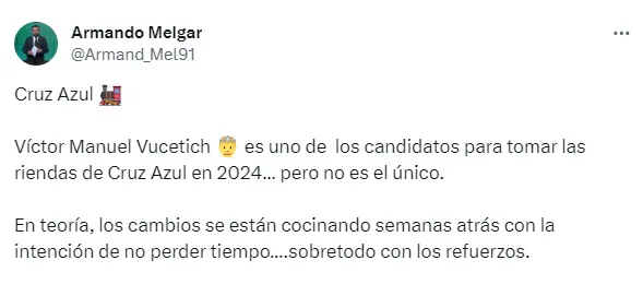 “Víctor Manuel Vucetich es uno de los candidatos para tomar las riendas de Cruz Azul en 2024… pero no es el único. En teoría, los cambios se están cocinando semanas atrás con la intención de no perder tiempo… Sobretodo con los refuerzos”, fue la información publicada por el periodista acerca de los esfuerzos que se estarían realizando desde La Noria, con miras al Clausura 2024, y para tener a los nuevos elementos lo antes posible.