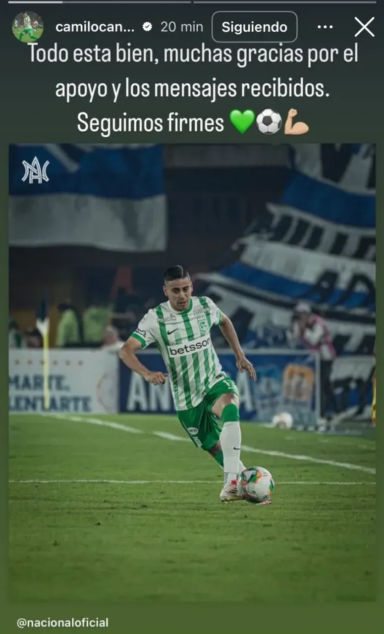 Esto viene luego de las palabras del propio jugador, quien en su cuenta personal de Instagram llevó tranquilidad. “Todo está bien, muchas gracias por el apoyo y los mensajes recibidos, seguimos firmes“, esbozó Camilo, quien tiene contrato con el verdiblanco hasta finales del 2025.