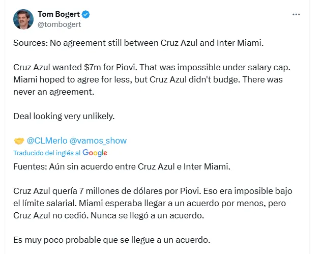 En ese escenario, el periodista Tom Bogert, especialista en la MLS, fue tajante sobre el estado de la operación: “Aún sin acuerdo entre Cruz Azul e Inter Miami. Cruz Azul quería 7 millones de dólares por Piovi. Eso era imposible bajo el límite salarial. Miami esperaba llegar a un acuerdo por menos, pero Cruz Azul no cedió. Nunca se llegó a un acuerdo. Es muy poco probable que se llegue a un acuerdo”, explicó en sus redes.