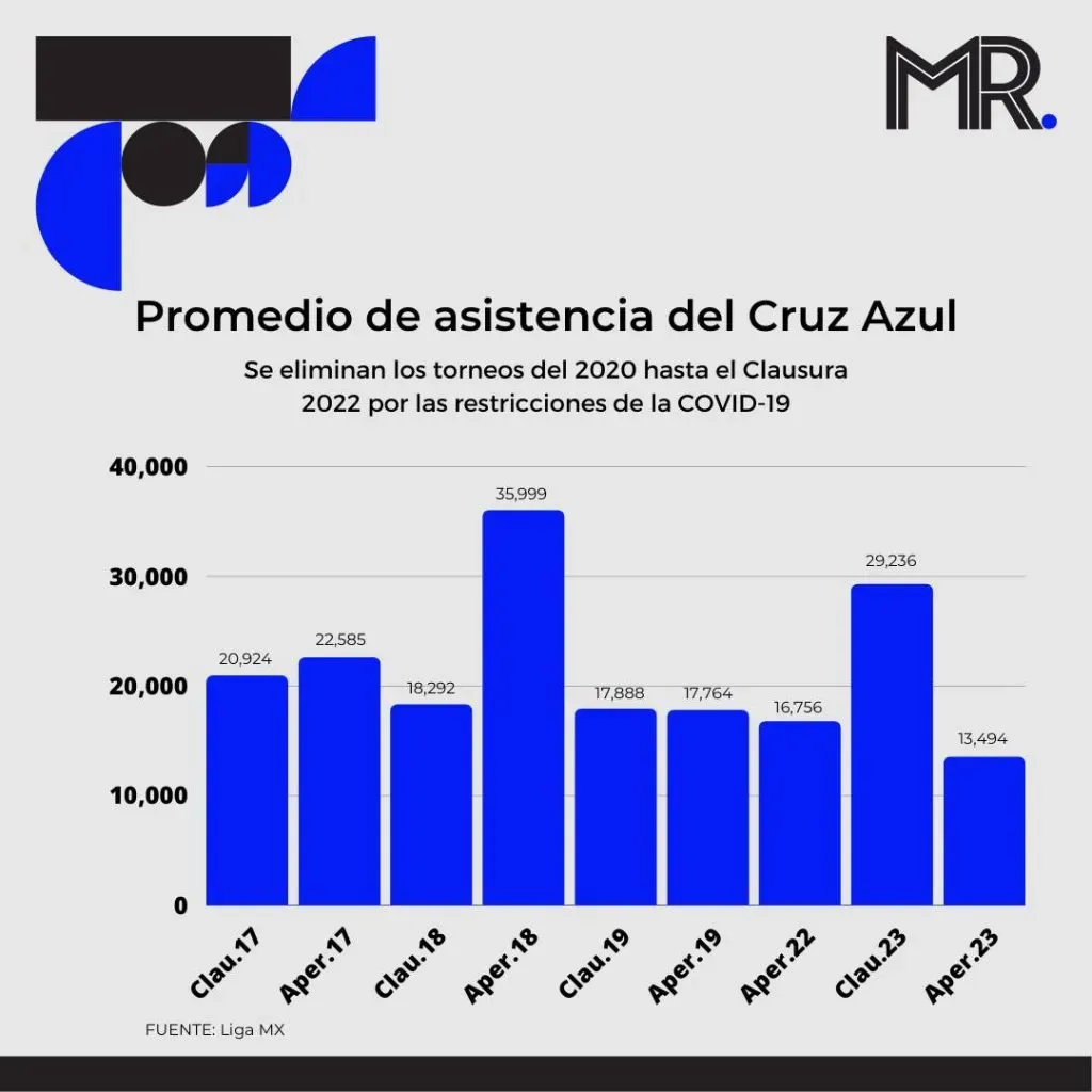 Cruz Azul tendría un promedio de 13,495 aficionados por partido, en lo que va del presente torneo, en el que apenas ha podido sumar un punto de los 12 posibles, lo cual lo tiene hundido en el último lugar de la clasificación.