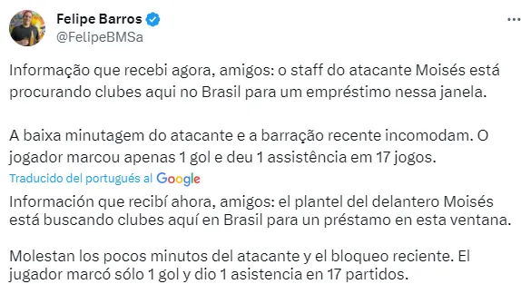 “Información que recibí ahora, amigos: el entorno del delantero Moisés está buscando clubes aquí en Brasil para un préstamo en esta ventana. Molestan los pocos minutos del atacante y el bloqueo reciente. El jugador marcó solo un gol y dio una asistencia en 17 partidos”, publicó el periodista, a través de su cuenta de Twitter.