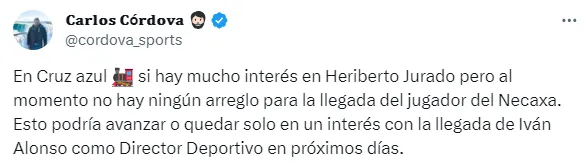 “En Cruz Azul si hay mucho interés en Heriberto Jurado pero al momento no hay ningún arreglo para la llegada del jugador del Necaxa. Esto podría avanzar o quedar solo en un interés con la llegada de Iván Alonso como Director Deportivo en próximos días”, informó el periodista Carlos Córodva, acerca del panorama del extremo hidalguense.