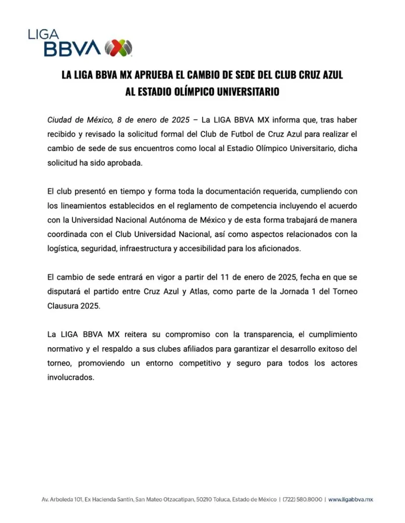 La Liga MX ha autorizado oficialmente a Cruz Azul a cambiar de sede, convirtiendo el Estadio Olímpico Universitario en su nuevo recinto local a partir del Torneo Clausura 2025. Este movimiento representa una nueva fase en la trayectoria del club, que aspira a fortalecer su presencia en un estadio emblemático de la Ciudad de México.