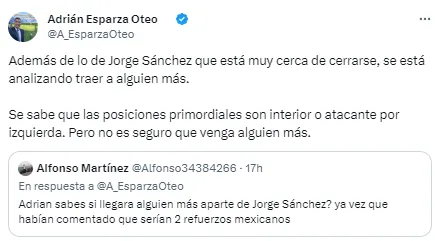 “Además de lo de Jorge Sánchez, que está muy cerca de cerrarse, se está analizando traer a alguien más. Pero no es seguro que venga alguien más”, informó el periodista especializado en el día a día de Cruz Azul, a través de su cuenta de Twitter.
