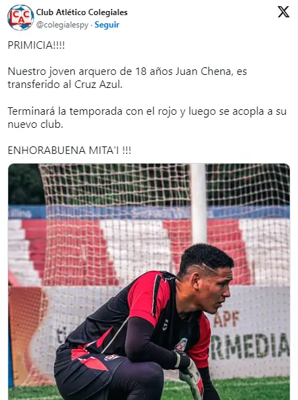 Incluso, el presidente de Colegiales reveló todos los detalles del posible fichaje de Juan Chena con Cruz Azul. El directivo aseguró que reportaría en diciembre en La Noria, ya con 18 años cumplidos, en una transacción de compra definitiva por el 100% de su ficha y con un contrato que sería por los próximos tres años.