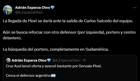 “Cruz Azul lanzó oferta y avanzó bastante por Gonzalo Piovi. Cerca el defensor argentino. La llegada de Piovi se daría ante la salida de Carlos Salcedo del equipo“, informó el reconocido periodista, especialista del día a día de Cruz Azul, a través de su cuenta de Twitter, respecto a las últimas novedades por el defensor argentino.