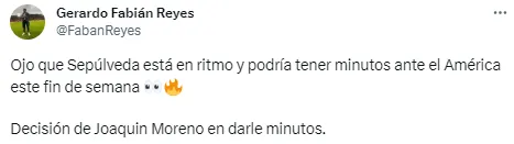 Según la información del periodista de Fox Deportes, Armando Melgar, Sepúlveda tiene chances de sumar minutos ante las Águilas el próximo sábado. Aunque cabe pensar que estaría sentado en el banquillo, la fuente indicó que dependerá del Ingeniero utilizarlo o no.